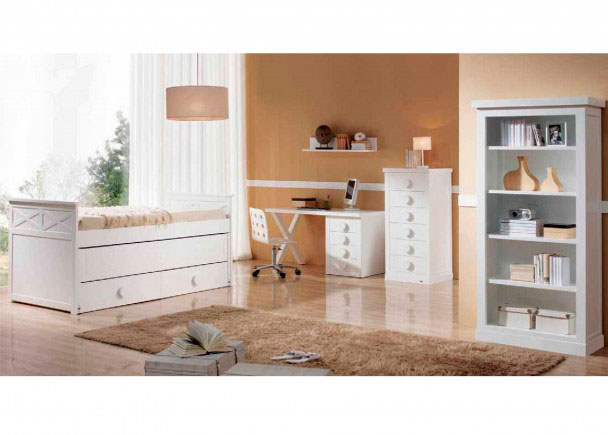 Dormitorio infantil de gran calidad fabricado en DM lacado con cama compacta modelo ASPAS, 2 somieres y Kit de 2 cajones